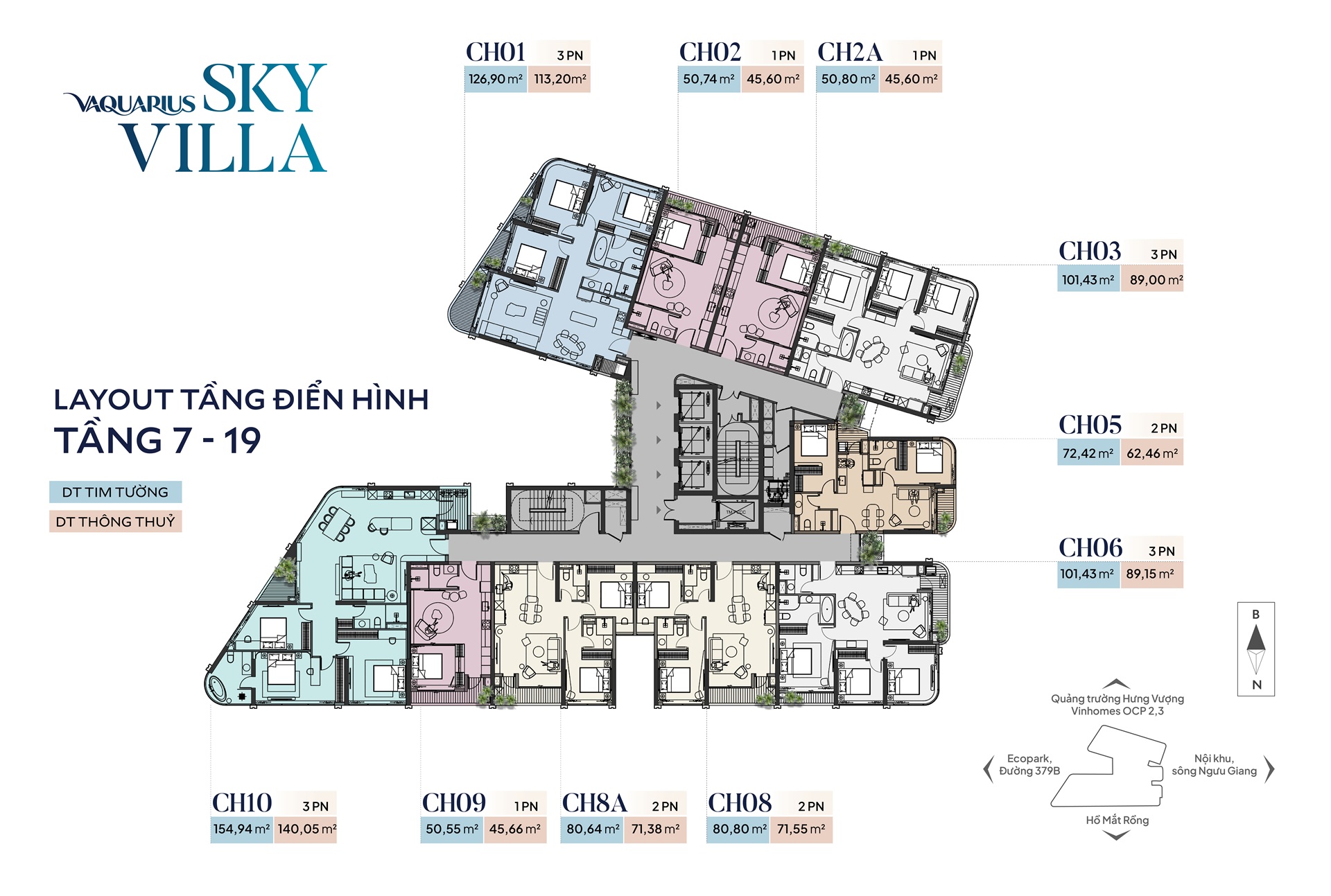 | Tiếp giáp | ● Phía Đông: giáp vườn hoa nội khu và khu thấp tầng Vaquarius ● Phía Tây: giáp đường ĐT.379B ● Phía Nam: giáp hồ Mắt Rồng và cụm tiện ích ven hồ ● Phía Bắc: giáp trục đường chính dự án Vaquarius, phân khu A và quảng trường Hưng Vượng |