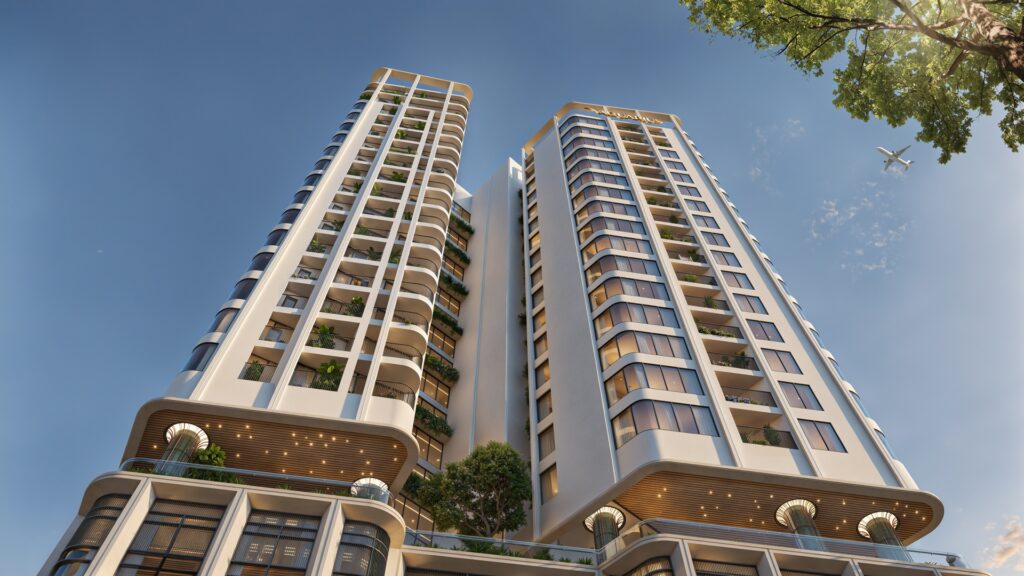 22 tầng, trong đó gồm: – 2 tầng hầm (1 tầng hầm và 1 tầng bán hầm) – 20 tầng nổi (5 tầng thương mại, 15 tầng căn hộ) |